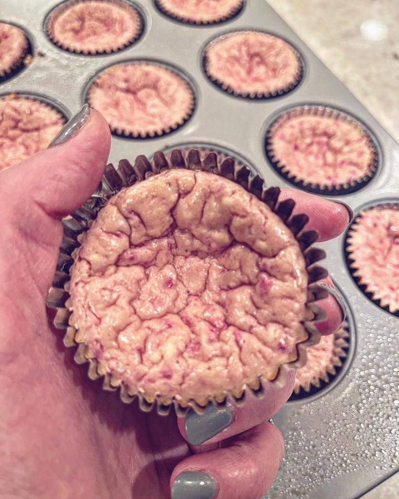 - Lastly add the raspberries and either mix until fully incorporated OR fold in to create more of a marbling. Divide mixture among the 12 muffin cups.