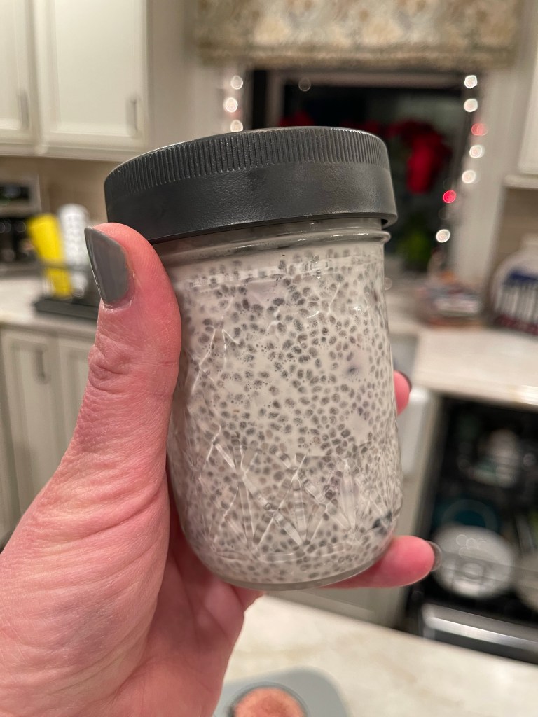 - Transfer mixture to four individual jars or small storage containers, add blueberries to each and stir with a spoon.